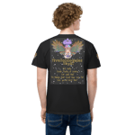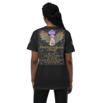 Back of Shirt says: "Be Safe, Drink Plenty of Water, Eat good food, Things that feed your soul, See you all next time!" Which is their signature sign off line for streams.